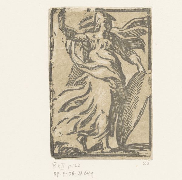 Curator: Here we have "Man with Lute", an etching by Antonio da Trento, created sometime between 1520 and 1550. What are your first thoughts? Editor: It evokes a strong sense of melancholy, doesn’t it? The man's posture, the subdued tones of the etching, everything seems to weigh heavily on him. He’s almost imprisoned in the composition. Curator: Precisely! Notice how Trento utilizes the etching technique. The density and direction of the lines create both form and shadow, imbuing the figure with this incredible sculptural weight, a signature element of Mannerism. It also draws on certain archetypes of lamentation found throughout art history, think classical depictions of melancholy philosophers. Editor: And consider that instrument. The lute symbolizes harmony and balance but is often associated with unrequited love and longing. The figure’s pained expression, the discarded instrument... it becomes a statement on social constraints and the burdens of courtly love in that era, or maybe on the limits placed upon the artist himself. Curator: An excellent point! I see it also in light of broader visual language that represents both physical and metaphysical balance in art and in Renaissance humanist philosophy: reason versus emotion. Editor: And perhaps the physical discomfort inherent in playing stringed instruments becomes an analogy for societal tension as well. Curator: It could suggest, quite radically for its time, a critical evaluation of existing power dynamics, absolutely. Thank you, those thoughts prompt reflection. Editor: Indeed, artwork as a form of resistance or contemplation during a restrictive epoch is something very fascinating to reflect upon.