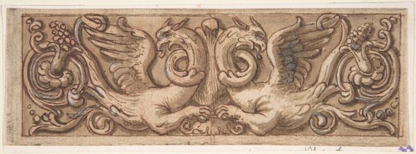 Editor: This is "Design for a Frieze, with the Arms of Cardinal Rangone," attributed to Baldassare Peruzzi. It looks like a pen and ink drawing, full of swirling forms and figures. It feels both classical and kind of chaotic. What social role did designs like this play? Curator: This design, likely intended for the Cardinal's residence, speaks volumes about power, patronage, and the visual language of the Renaissance elite. Consider the Cardinal's role in society: how does this ornate design reinforce his authority and project a specific image? Editor: So, it’s not just decoration; it’s a statement? Curator: Absolutely. It’s a curated display of wealth and influence, reflecting a very specific intersection of church, state, and artistic production. The lion, the child... what narratives do they construct in relation to Cardinal Rangone? Editor: I hadn't thought of it that way. It's fascinating how much this frieze communicates about the Cardinal's world. Curator: Exactly. Art is never neutral. It actively shapes and reflects the power dynamics of its time.