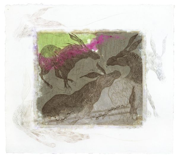 Curator: This is Stanley Boxer's "Gatheringforsomereason," now held in the Tate Collections; the date of its creation is unknown. Its dimensions are 331 by 360 millimeters. Editor: The composition strikes me as both dreamy and unsettling. The delicate lines and pastel washes create a sense of ethereal beauty, but there's an underlying tension, a vulnerability. Curator: Boxer's process is fascinating. He often combined etching with monotype, layering textures and colors through printmaking. This piece showcases his mastery of line and his experimental approach. We can see the hand of the artist in every mark. Editor: Absolutely. And those nude figures amidst the fauna, combined with the title—it hints at hidden social dynamics. Perhaps a commentary on the vulnerability of the body, or the role of women within a social landscape? Curator: It invites us to contemplate the labor involved in printmaking, and the deliberate choices Boxer made with his materials. He elevates the craft. Editor: True, and it pushes us to consider how art can mirror, and perhaps critique, societal norms, especially where gender and nature intersect. A beautiful, complex piece.
