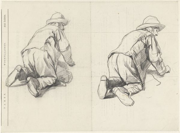 Curator: This drawing, dating from 1840-1880, is entitled "Standing and Sitting Man" and it’s the work of Johannes Tavenraat. You can currently find it here at the Rijksmuseum. Editor: There’s something melancholy about this work; the figures are withdrawn. Is it merely the use of ink that lends it this rather somber mood? Curator: I think we need to consider the figures' place within broader societal dynamics, perhaps the impact of industrialization on everyday life, evident in their poses, detached from the traditional settings one might expect in Romantic art. Editor: It's the hat worn by the standing man that interests me. While faceless, the artist focuses the clothing; is it conveying something to you? Curator: Most likely. Dress has always served as a marker of identity, class, even resistance. Are they subjects caught in a transitional moment? Notice, however, the seated man. While resting, his gaze remains fixed. Is he simply tired? Or is he watching, waiting, perhaps resisting some unmentioned power dynamic? Editor: There’s definitely a tension despite their static poses. You mention resistance, do you find their portrayal suggests anything in regards to social or political reform during the period it was created? Curator: These men could be understood as metaphors for the displaced individual navigating changing landscapes of power, where visibility and invisibility, silence and speech, became forms of resistance and assertion. Editor: It brings me to consider archetypes of the time. One stands holding a walking stick, which seems representative of direction and guidance. And in opposition the other has become horizontal; is there any connection, whether physical or psychological between the two men? Curator: Possibly. Remember these works are situated in a moment of immense societal shift, where gendered and racial norms were being challenged, the work suggests something regarding ideas of change. I would be curious to see where those connections are more thoroughly placed in the contemporary moment. Editor: Thank you. I now view this work and those potential archetypes through a completely new lens!