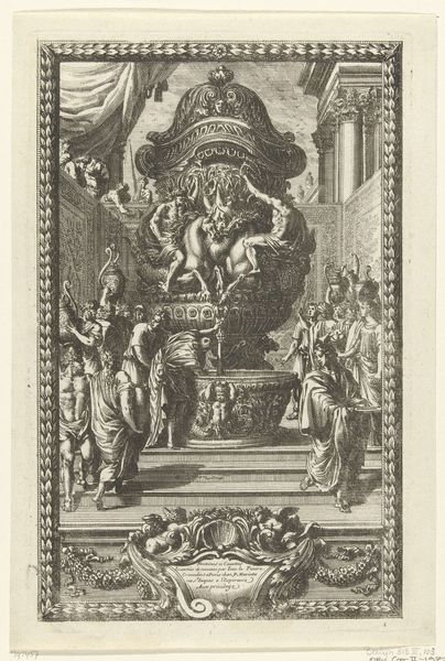 This engraving, "Titelblad: Vases à l'Antique," was created by Jean Lepautre in the 17th century. The image, dominated by a monumental vase, draws us into a world where classical form meets detailed ornamentation. Notice how the vase acts as a central structural element, framed by architectural features. The figures seated atop it and gathered below create a dynamic interplay of levels. Lepautre's use of line is meticulous, with precise strokes defining the vase's contours and the folds of drapery. This attention to detail lends the print a sense of depth and texture. The vase is adorned with classical motifs, reflecting the era's fascination with antiquity. Yet, it also hints at the decorative excesses of the Baroque, presenting a dialogue between classical restraint and ornate exuberance. This tension destabilizes the pure, clean lines often associated with classical forms.