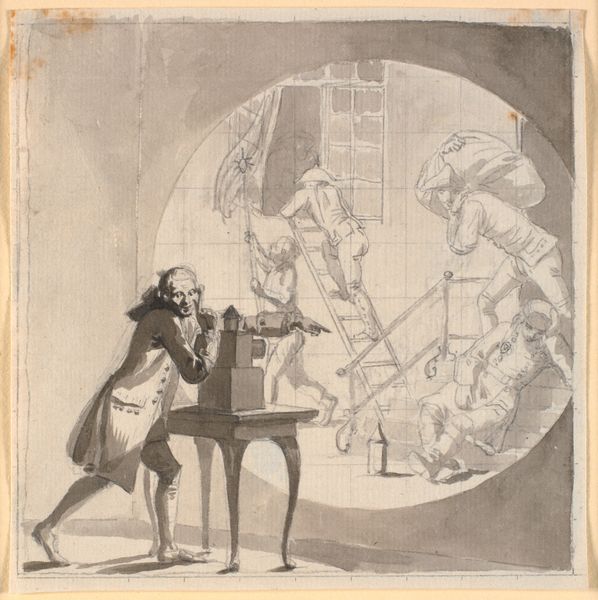 Editor: This print, titled "Kiøbenhavns Skilderie" No. 3 by J.F. Clemens, created sometime between 1785 and 1788, is just fascinating! The composition, the light, feels staged, yet incredibly dynamic with figures scattered and the foregrounded man, appearing to be observing a construction on the table, what do you see in this piece from a formalist perspective? Curator: Indeed. Notice how Clemens utilizes line – predominantly thin, precise etchings – to define form and texture. The tonal range is narrow, resulting in an overall lightness. The eye is led primarily from the foreground figure, then to the activities on the staircase and is then subtly confined within the oval framing device that surrounds the scene itself. Editor: I find that oval so interesting! It almost feels like we are looking into a peepshow, viewing a private world. What about the contrast in the depicted events with foreground activity. Curator: Precisely, that framing encourages a distanced observation. But observe further: Clemens directs focus by the arrangement and size of figures within the picture plane and he positions the man's gesture within the scene – not just a subject of scrutiny, but active intervention into that which he observes and potentially constructs. The piece asks us what the nature of looking actually entails. Is it simply a moment in a theatre of representations? Editor: That's an insightful viewpoint. Now I am looking at it less as a snapshot of a staged moment and more as a carefully constructed commentary on the role of observation itself, its capacity for control and the construction of perception. Thank you for illuminating those key aspects. Curator: My pleasure, by isolating and examining its components we uncover its capacity to reflect not just scenes of a given time but the conditions of sight itself.