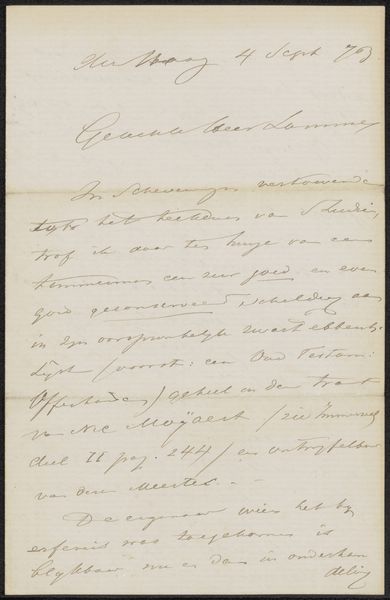 Curator: Here at the Rijksmuseum, we have a fascinating piece attributed to Johannes Stroebel, believed to be from 1866: a letter titled "Brief aan de Commissie van de Tentoonstelling van Levende Meesters in Utrecht"—or "Letter to the Commission of the Exhibition of Living Masters in Utrecht." Editor: It feels incredibly personal, even intimate, despite being a formal letter. The composition leads my eye from the address right down to the signature in a swift, graceful movement. Curator: Indeed. Consider the nuances of line, its weight and direction, as it structures this handwritten communication. It's rendered in ink on paper. The crispness of the medium lends immediacy. The visual cadence set up by varying densities, flourishes, and overall structure, is very appealing to me. Editor: The content alone is a window into the Dutch art world of the mid-19th century. This particular artist seems to be hoping his work is shown. What an emotional roller coaster it must have been to submit, await consideration, and either be accepted or face rejection. I wonder if this yearning, uncertainty, if all those emotional struggles, still linger here, as part of the message. Curator: Interesting point. What if the appeal lies less in decoding the context and more in isolating fundamental relations among elements in this "Letter" or artwork? Editor: Perhaps. The very act of appealing—writing the letter—seems infused with cultural meaning. In requesting consideration for the exhibition, is Stroebel subconsciously, also touching on ideas of national identity? Was the ‘living masters’ exhibition itself striving for particular definitions? Curator: Now, your line of thought opens intriguing pathways of exploration! I wonder if a study in terms of historical or philosophical underpinnings would suggest itself? The very term "Living Masters" demands such consideration in this piece! Editor: Precisely! By connecting with the present, the symbolic weight, it breathes across centuries. I think a great piece touches these human moments to remain impactful, no matter when the work was created. Curator: Very well said. It certainly reveals that "Brief aan de Commissie" is a very rich piece worthy of further explorations and reflections.