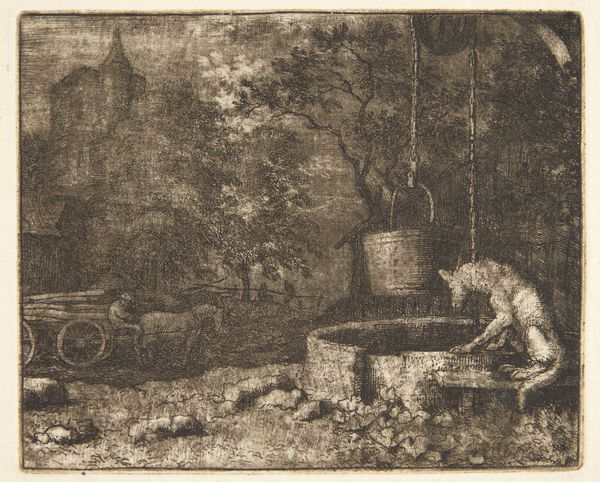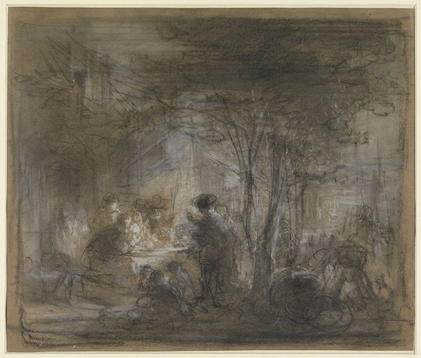 Editor: So, here we have "Three Figures at a Table" by Christian Wilhelm Ernst Dietrich, created sometime between 1722 and 1774. It's an etching, really dark and atmospheric. It almost feels like we're peering into a clandestine meeting. What do you see when you look at it? Curator: Ah, this piece! It’s like a little window into another world, isn't it? For me, Dietrich manages to capture a feeling more than just a scene. The baroque period loved drama, right? Think about it—that almost claustrophobic darkness offset by the small pool of light, the anonymity of the figures… Makes you wonder what they're up to around that table, doesn't it? I find myself thinking, is it a game, a deal, or perhaps just the companionship after a long day? What feeling does the scene evoke in you? Editor: Definitely intrigue, a little bit of mystery! But also a kind of starkness. It seems very...unadorned, almost bleak. Curator: That bleakness is part of the story, I think. Dietrich wasn't just interested in pretty pictures; he wanted to show life, raw and unvarnished. That unadorned feeling adds authenticity, making us feel like we're truly witnessing a moment from everyday life. What would change if this scene would be coloured, in your opinion? Editor: Hmm, interesting question. I think colour would almost ruin it. The starkness of the monochrome really emphasizes the mood, I think it provides a strong sensation to the viewers eyes and mind! Curator: Exactly! The absence of colour becomes a powerful tool. The choice of the etching also brings it back to it's true origin and history! This whole piece resonates with a sense of quiet reflection on the ordinary, a skill I’m perpetually striving to emulate, really. Editor: This makes me look at etchings from that era with fresh eyes, knowing that this "bleakness" contributes significantly to the image itself! Curator: Absolutely, that and it helps to unveil that simple is good and efficient. Every artist has to remember that from time to time.
