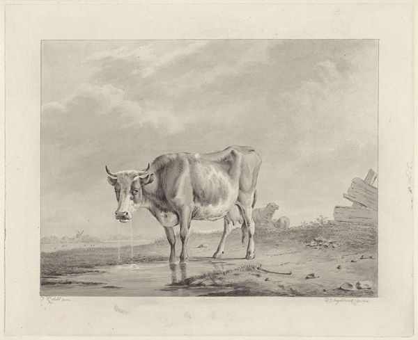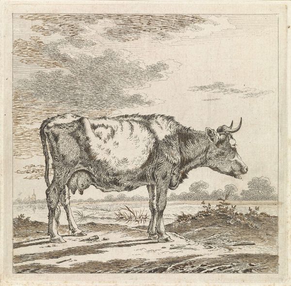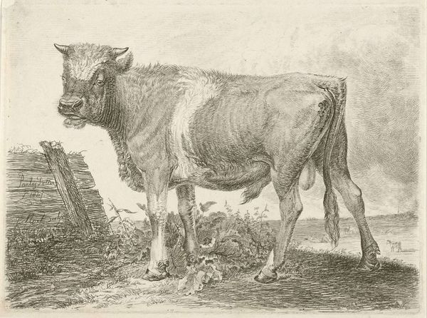 Jean Bernard made this etching of a bull, likely in the Netherlands, sometime around the late 18th or early 19th century. The image presents a bull in profile, standing in a pasture. In the background, a church spire rises above the horizon, a common cultural symbol in the Dutch landscape. What makes this image interesting is its focus on agricultural life, reflecting the economic importance of livestock in the Netherlands. During this period, Dutch agriculture was highly developed, and images of farm animals would have resonated with a broad audience involved in agriculture. Bernard’s print can be seen as part of a larger visual culture that celebrated Dutch industry and rural life. The detailed rendering of the bull emphasizes its size and strength, perhaps idealizing it as a symbol of the nation's agricultural prowess. Understanding this print requires looking into the economic and social history of the Netherlands, consulting agricultural records, and studying the broader artistic trends. This approach allows us to understand how art reflects and shapes cultural values.