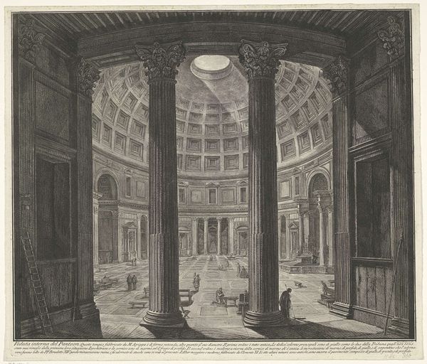 Curator: Here we have a print from Giovanni Battista Piranesi’s series, *Vedute di Roma*, showcasing an interior view of the Pantheon. Editor: It's intensely theatrical! The stark contrast and exaggerated perspective create a dramatic, almost dreamlike space. Curator: Piranesi masterfully uses etching and engraving to articulate the grandeur of Roman architecture. Notice the precision in rendering the coffered dome and the colossal columns. Editor: That grandeur, however, can be interpreted as a celebration of power structures. Rome, and indeed architectural feats such as this, carry complicated historical narratives— colonialism, conquest. The details, in all their precise glory, reflect this fraught history. Curator: Undoubtedly, yet look at the treatment of light. The oculus is a clear focal point, bathing the interior in what appears to be divine illumination. The way it defines form is masterful. Editor: I think it also reflects the artist’s agenda: Rome as the pinnacle of Western civilisation and aesthetic achievement. This perpetuates a narrative that centers European cultural heritage above all others, often marginalizing other histories. Curator: Regardless, the sheer scale of the space, conveyed so powerfully through perspective, forces a re-evaluation of how we situate ourselves within architectural history. Editor: Exactly! The perspective almost seems designed to remind us of the human cost of the society whose values and structures are embodied in stone all around us. Curator: The skill involved in creating these images and how Piranesi uses classical elements to invite the viewer into dialogue about timeless aesthetic questions – that’s what intrigues me the most. Editor: For me, it's about questioning why we still pedestalize this vision of Rome when the very stones whisper stories of privilege, patriarchy, and conquest.