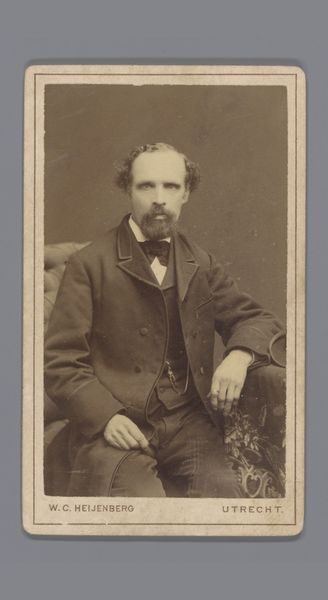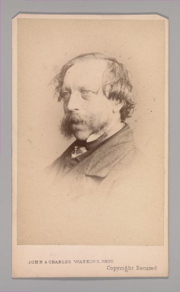 Curator: This is a portrait of Charles Baxter, created in the 1860s by John and Charles Watkins. It's an albumen print, now residing here at The Met. Editor: There's a somber, almost contemplative quality to it. The soft gradations of tone lend a dreamlike air, even with the subject's direct gaze. It’s a tight composition, really holding you on his face. Curator: Watkins was a successful photography studio in London. In terms of the studio's context, photographic portraits gained traction because it catered to middle-class consumers looking to partake in the Victorian era's "cult of celebrity", as it were, and also partake in that culture. The use of albumen prints suggests affordability but also high quality. It strikes a balance. Editor: I find the detail in the rendering of his hand and the way it supports his face particularly compelling. It seems so carefully posed and composed. And also it is so obviously "of the time" with such detail captured in the beard. Look at that little ring! How does its glint draw your eye so easily? Curator: The act of posing itself in Victorian photography reveals societal values. Note his dignified stance. What Watkins offered his clients was more than mere representation; it was social currency in a society where likeness conferred respectability. We have the "genre-painting" tag here as well. It reveals aspirations of emulating a tradition reserved for painted images. Editor: Thinking about structure, the light seems to define form subtly. His face emerges almost sculpturally. The tones used emphasize texture without heavy contrast and contribute greatly to the mood we mentioned earlier. It keeps my eye wandering his face looking for more. Curator: Absolutely, the emphasis on tone is very strategic given that we know photographic studios back then manipulated variables in their work to meet their audiences’ aesthetic standards. To some extent they also tried to capture not only their subject’s likeness, but his social standing as well. Editor: Studying his thoughtful posture closely makes me curious about who he really was. There is an echo of quiet elegance to it. Curator: And for those interested in the Victorians' projection of values, I'm sure his biography holds even greater appeal. Editor: Exactly, and for the casual viewer there's an artistic value in exploring the arrangement of photographic tones.