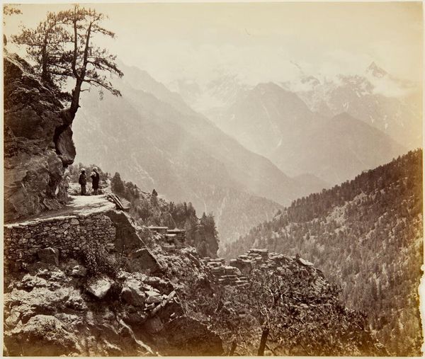 Curator: This photograph, taken by Samuel Bourne, is titled "A Bit on the New Road Near Rogi." The composition is striking. Editor: Indeed. It feels so… precarious. The eye is drawn to that narrow, almost imperceptible path clinging to the cliff face. One wonders about the human cost of such infrastructure. Curator: Note how Bourne uses the dramatic sweep of the mountains as a backdrop. The tonal range, from the dark, textured rocks to the misty peaks, is masterful. Editor: But who benefitted from this "new road"? Surely not the local communities, whose lives were likely disrupted by colonial ambitions masked as progress. Curator: The photograph itself, as an object, speaks to a specific moment in photographic history. Consider the albumen print process and its contribution to this image's unique qualities. Editor: It also represents a visual perspective deeply embedded in the colonial gaze. Bourne's romanticized depiction elides the complex realities of the landscape and its inhabitants. Curator: It's a technically brilliant photograph, and I appreciate its compositional strength. Editor: Yes, and it's imperative to confront the narratives it perpetuates.