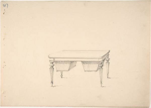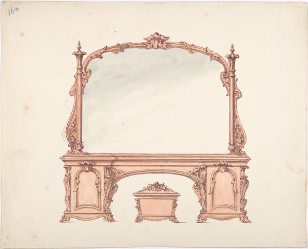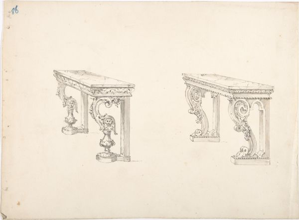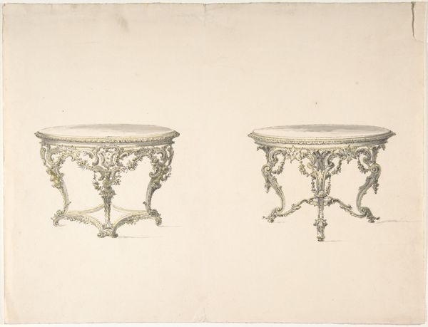 Editor: Here we have a design for a table with ornate legs, dating back to the 17th century, currently housed at the Met. It’s an ink and watercolor drawing on paper, and what strikes me most is just how elaborate the ornamentation is, especially compared to the very simple table top. What's your take on this? Curator: It's fascinating to consider such designs within the context of the Baroque period, where art served as a powerful tool of visual rhetoric. Think about the social function of furniture like this. Who would have owned it? Editor: Probably someone very wealthy, right? Aristocracy? Curator: Precisely. Furniture during this era wasn't just functional; it was a symbol of status, a visual declaration of wealth and power. These ornate legs aren't merely decorative; they’re practically shouting about the owner's position in society. The elaborate ornamentation demonstrates patronage of the arts and displays social prominence. Editor: So, it's less about comfort and more about sending a message? Curator: It’s a complex equation. Certainly, there's a degree of function, but the aesthetic choices amplify the statement being made about power and taste. How might the display of such a piece affect the public's perception of those in power? Editor: I suppose it would further highlight the gap between the wealthy and the working class, almost creating a sense of aspiration mixed with, maybe, resentment. Curator: Exactly. Now consider where such a table might be placed within a grand house, and how the architecture, paintings, and even the clothing of the people around it all contribute to a carefully constructed image. Editor: It’s interesting to consider how this drawing isn’t just a design, but also a piece of social commentary in itself. I had been missing that before! Curator: Yes, art provides a lens through which we can see both intentionality and social reactions, across time.