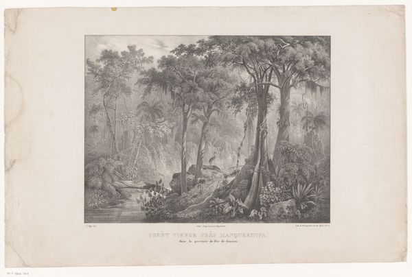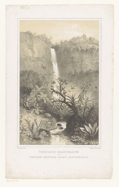 Curator: This is Paulus Lauters’ “Waterval bij Tondano,” dating from the period of 1843 to 1845. It’s an engraving, printed in ink on paper, and held here at the Rijksmuseum. What are your initial thoughts? Editor: Striking. The light values and precision of the engraving lend it a certain coolness, a controlled dynamism. The scale of the landscape, contrasted with the tiny figures at the base of the waterfall, is compelling. Curator: It's an excellent example of 19th-century Orientalism within the framework of Dutch colonialism, romanticizing the “exotic” landscape of the Dutch East Indies. Look at how Lauters positions the Indigenous figures; they are dwarfed, practically consumed by the overwhelming “natural” world. Editor: Indeed. It reflects a specific, mediated experience, one undoubtedly shaped by colonial interests and the desire to document and categorize the resources of the landscape. The emphasis seems less about an emotional connection to nature, more about a kind of resource inventory. Consider the labor involved: engraving like this was highly skilled, a product of specific training. The choice of print also makes it reproducible, extending its influence and impact beyond the immediate viewer. Curator: Precisely. We have to interrogate the power dynamics implicit in its production and consumption. What ideologies were being propagated through the visual language? This work operates within a larger network of colonial discourse, solidifying ideas of European dominance. And we can look at it today and think about those issues in the light of contemporary post-colonial theory and discourse. Editor: And those issues manifest physically in the print. How much of the paper was sourced from the region it represents? Was the ink a product of local or European industries? Who profited from its sale, circulation, and continued appreciation? It pushes one to ponder the commodification of this “oriental” space and its transformation into a collectible artifact. Curator: A valuable consideration! Seeing through a contemporary lens encourages awareness about power structures both past and present, doesn't it? Editor: Absolutely. When examining it under the lens of materiality and colonial power, the romanticism seems to further complicate its context and impact. Curator: A colonial picturesque masking power dynamics...thank you for your insights, it provides new layers of considerations. Editor: The pleasure's all mine. Thank you, it encourages considering it far beyond an artwork and instead as an art object entrenched in layers of political undertones.