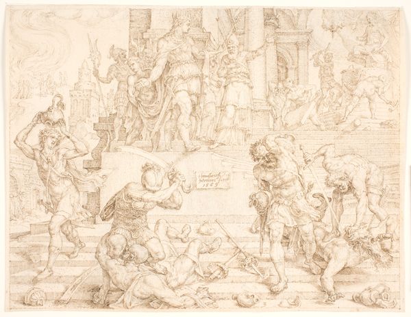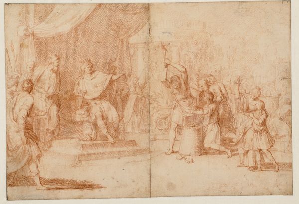 Editor: This drawing, "Two Men Before a Judge in a Crowded Courtroom," probably created sometime between 1650 and 1704 by Egbert Jasperszoon van Heemskerck I, really gives off a tense atmosphere, like everyone’s holding their breath. The use of sanguine—that red chalk—adds to the drama, almost like a foreshadowing of something bloody. I’m wondering what your take is on this, like, what stands out to you when you look at this drawing? Curator: You know, that sanguine color—it whispers secrets, doesn't it? To me, the chaos is meticulously composed. Look at how Heemskerck corrals the crowd's energy. It’s a bit like staging a play, each figure a character, and we, the viewers, are given a front-row seat to justice—or perhaps injustice—unfolding. Do you feel the story emerging as you gaze longer? Editor: Yeah, I get what you mean about the stage. There's this almost artificial feeling, but then you zoom in on individual faces, and it feels more real and messy. It’s this weird push-and-pull between order and chaos. Is that a Baroque thing, trying to make chaos beautiful? Curator: Precisely! It's the Baroque dance, dear student – the tension between the divine order and earthly disorder. Heemskerck captures the humor too. It’s dark humor, obviously, because this isn’t TikTok. These scenes are always relevant, always showing humanity wrestling with its demons – with authority. Does the work perhaps spark an anecdote from your life? A memory that sings with recognition? Editor: I guess that’s why it feels so timeless. This conversation’s really made me look at the artwork, and at courtrooms in general, with totally new eyes! Curator: Art – and indeed life itself – should ideally lead us all on wild flights of the mind; a place we create a meaning from the past!