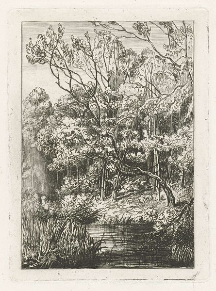 Curator: This is Rodolphe Bresdin’s etching from 1880, titled "The Forest of Fontainebleau," presently residing at The Art Institute of Chicago. Editor: Dense! Almost claustrophobic, in a way. The textures are incredibly intricate. What's particularly striking is the almost complete lack of breathing room in the composition. Curator: Indeed, the forest depicted rejects any notions of classical, idealized landscape. Instead, it embraces a realism that hints at Romanticism in its sublime density. Editor: Tell me about that density. How does the composition direct us, if at all? Curator: Note how the layering of lines and textures, achieved through meticulous etching, creates a deep visual field while simultaneously flattening the image. Our eyes struggle to find a focal point, as if lost within the woods themselves. It recalls notions around Baudelaire and flânerie... being adrift, aimless. Editor: You know, there is something evocative of 17th-century Dutch landscape painting here too. Except, there’s no discernible narrative. Where are the people? Even the light is diffuse, rejecting any singular perspective. It’s almost a metaphor for something… the impenetrable quality of the forest reflecting an unknowable internal space. Curator: Fascinating thought. It could even speak to Bresdin's own difficult life. Socially marginalized and an outsider, he created art reflecting that alienation through this embrace of natural wilderness as an unknowable labyrinth. Consider, too, the choice of printmaking. Accessible as an artistic medium to produce in some respects, while still labor intensive. A rejection, perhaps, of artistic establishment that could suggest something beyond just a formal analysis. Editor: Yes, this complexity moves us beyond merely depicting a forest. This piece almost demands psychoanalysis of the artist and contemporary viewers. There's almost a melancholic feeling despite, or perhaps because of, its intensity. It has an uncanny ability to disturb while simultaneously drawing one into its mesmerizing patterns. Curator: Ultimately, I suppose this print shows us how formal mastery combined with socio-historical awareness can elevate a mere landscape to the status of a mirror held up to human consciousness. Editor: A complex encounter that will leave us reflecting on nature, the mind and Rodolphe Bresdin for a good while after. Thank you.