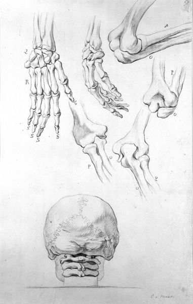 Editor: Here we have Karel van Mander III's drawing, "Hand in profile; four renditions of the elbow joint; spine with rib cage and pelvis, frontal", created sometime between 1660 and 1663. I’m struck by its stark realism. How do you interpret this work within its historical context? Curator: Well, looking at this piece, I think it is crucial to consider what the artist is trying to convey about the body at a time when scientific understanding was rapidly evolving but constrained by social and religious norms. In what ways does this study of anatomy potentially challenge or reinforce power structures within that society? Editor: That's an interesting point. I guess I hadn't considered the potential societal impact of anatomical studies like this. So, is the artist making some kind of statement by depicting the body so frankly? Curator: Potentially. Think about who had access to this kind of knowledge and how it was used. Anatomical drawings like these were often the domain of elite male physicians and artists. Considering the social history of medicine, how might this representation of the body relate to contemporary understandings of gender, class, and perhaps even race? It certainly privileges a Western European ideal. Editor: It does feel very detached, almost clinical. But could it also be read as empowering, as giving agency to the artist to explore the very structure of being human? Curator: Empowerment for whom? It's crucial to examine who benefits from this depiction and who might be marginalized or excluded. And what are the ethics of representation when dealing with bodies, especially considering that the study of anatomy has often been entangled with the exploitation of marginalized communities? Editor: I see your point. I guess I was focusing too much on the artistic merit and not enough on the power dynamics at play. Thanks, that really gives me a new perspective on the piece. Curator: Exactly. It's important to remember that even seemingly objective representations like this are imbued with social and political meaning. This conversation has reminded me how essential interdisciplinary perspectives are in art historical analysis.