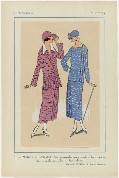 Curator: Here we have "Trés Parisien, 1923, No. 4: SAPHIR", a drawing held at the Rijksmuseum. It's a captivating image rendered in what appears to be blue ink. Editor: My initial impression is one of subtle sophistication, with an almost ethereal quality created by the delicate pastel-like colours. The composition feels carefully balanced, drawing the eye to the elegant figures. Curator: The artist employs flat colour and a decisive line to depict two women in distinct dresses, capturing the Art Deco style that epitomizes 1920s Parisian fashion. Observe how the repetitive patterns create a visually stimulating surface. Editor: Absolutely, and the patterns on the dresses, while decorative, almost feel like secret languages themselves. Fashion as a kind of heraldry! There’s also a sense of the exotic, perhaps inspired by newfound global interests entering European visual culture at this time. Curator: A telling insight. Indeed, the interplay between form and surface here underscores the modern sensibilities of the era. Consider, too, how the illustration flattens depth, prioritizing design over naturalism. Editor: Precisely. These stylized women embody ideals of femininity and modernity of the time, and the clothing becomes symbolic. The light colors feel so fresh, in a world rebuilding itself after great disruption. Curator: It's a drawing that reminds us that an artist's technical facility can result in something truly stylish. The drawing provides us not only visual pleasures, but a chance to engage more thoughtfully. Editor: I’m leaving with a stronger sense of the cultural nuances conveyed through design and color, how art continues speaking across the ages, and with that silent echo of hope.