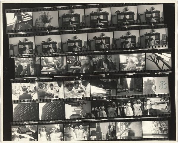Editor: We're looking at Robert Frank's "Hollywood 79," a gelatin silver print from 1958. It looks like a contact sheet, multiple frames showing a crowd, some cars, and what might be a statue. It feels very documentary, like a series of captured moments. How would you interpret this work? Curator: This contact sheet gives us a glimpse into Frank’s process, revealing a series of images that, taken together, critique the American Dream. Frank's choice to leave the frames connected is significant. Consider, what does that raw, unedited quality suggest about the manufactured image of Hollywood that was being projected onto American culture? Editor: So, it's about revealing the behind-the-scenes reality? I notice the repeated image of, I think, a car and some kind of statue of what looks like a performer...is he highlighting a theme by repeating that visual element throughout the contact sheet? Curator: Exactly. The repetition, particularly the contrast between the idealized Hollywood image represented by the figure on top of a vehicle – often thought to be Jayne Mansfield, being paraded to promote a movie - and the mundane reality of the surrounding crowds, is central. Frank uses the "decisive moment" to capture those everyday tensions and challenges us to look beyond the shimmering surface. How do these choices challenge the idealized image that Hollywood cultivates and the culture it was imposing? Editor: That makes sense. Seeing it as a critical commentary on Hollywood’s constructed image is insightful. And by using the contact sheet itself as the finished piece, it shows a truth that would usually be hidden. Curator: Precisely. Frank's “Hollywood 79” is less about the glamour and more about the machinery and the socio-political stage upon which fame performs. This way of displaying his photographic work gives the public permission to look a little deeper into a usually hidden world. Editor: I definitely have a richer understanding now. Seeing the artistic and cultural statements he’s making helps me move past a superficial assessment of it. Thank you!