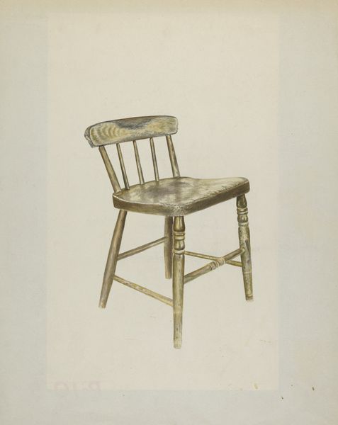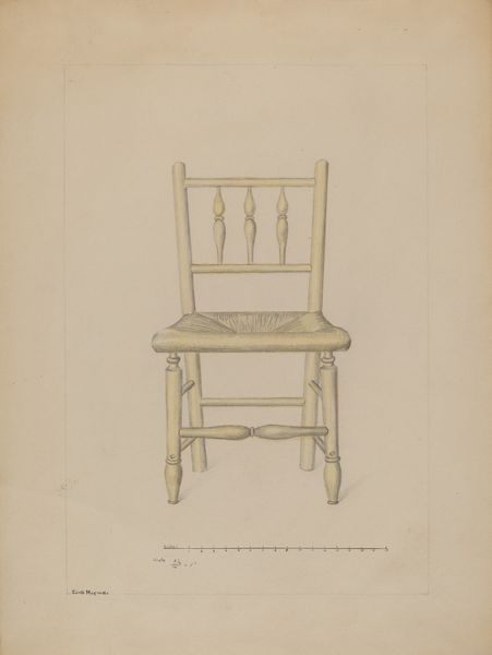 Editor: This is "Chair," a pencil drawing made around 1936 by Walter W. Jennings. I find the chair's simple design quite appealing; it almost feels like a blueprint, carefully illustrating its structure. What compositional elements stand out to you? Curator: It is crucial to observe how the artist organizes lines, shading, and the overall composition. The geometric rendering suggests precision, a stark contrast to the decorative foliage etched into the back. Notice the meticulous execution and balance across all four legs of the chair. Editor: The details in the foliage are quite intricate; they draw my eye despite the precision elsewhere. Are these deliberate contrasts? Curator: Exactly! We have a duality. Linear precision, giving stability and form, plays against the curving tendrils of floral decoration on the upper back rest of the chair. The contrast guides your attention while creating visual harmony. Notice also the subtle variations in line weight to create depth and dimension. The chair ceases to be simply an object. It transforms through line, creating a representation of a real object in front of the artist. Editor: So, through this study of line and form, Jennings is almost abstracting the idea of a "chair," stripping it to its core elements? Curator: Precisely. By emphasizing shape, Jennings asks us to consider not only what the object *is,* but also *how* we perceive and define its purpose through visual signs. Editor: I never thought a simple chair could offer such a rich formal reading! Curator: Indeed. Close looking always reveals complexities of representation that we often overlook.