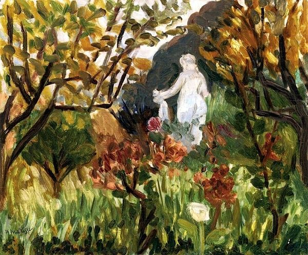 Editor: Henri Matisse's "Two Figures Reclining in a Landscape," from 1921, is an oil painting currently at the Barnes Foundation. The composition feels very flat and decorative, like a tapestry almost. The brushstrokes are visible and build up a sense of depth, but in a very simplified way. What do you see in this piece from a formalist perspective? Curator: From a formalist reading, one observes the arrangement of the compositional elements. Note the interplay between the horizontal figures and the vertical trees. This contrast structures the scene, dividing it into planes of existence. Editor: Planes of existence? Curator: Metaphorically. There’s a plane of activity—the reclining figures, painted with simplified forms, bordering on naive—and one of observation—the more densely rendered landscape. Do you notice the limited color palette? Editor: Yes, the painting mainly uses greens, reds and blues. It gives a rather limited effect and overall balance. Curator: Exactly. It creates a deliberate unity and impacts how one perceives space and depth. It draws attention to the constructed nature of the painting. What semiotic meaning might we extract from this artifice? Editor: Maybe it calls attention to the painting as an object itself, rather than trying to mimic reality. It's a world created through color and shape? Curator: Precisely. The essence of painting then lies not in replication, but in the act of creation itself, through a formal dialogue of line, color, and composition. A departure from realism, focusing on inherent aesthetics. Editor: So it's less about what the painting shows and more about how it shows it. Thank you for your insightful perspective. Curator: It underlines how much meaning is encoded in those formal choices. Always a learning opportunity.