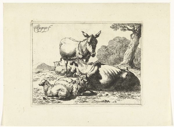 Abraham Jansz. Begeyn rendered this print, featuring a standing bull and a reclining cow with a sheep, using etching techniques. The pastoral scene is alive with symbols of fertility and domesticity. Throughout history, cattle have been more than mere livestock; they are icons of wealth, power, and sustenance. In ancient cultures, bulls were divine symbols of virility and strength, worshipped in mythology from Crete to Egypt. Notice how the resting cow, nestled beside the sheep, evokes themes of nurturing and care, mirroring the classical motif of pastoral harmony. Consider the image of Europa and the Bull, where Zeus transforms into a bull to abduct Europa, a powerful symbol of desire and transformation. The bull, a recurring motif, carries with it the weight of cultural memory, continually resurfacing and transforming across time. Here, the image engages our subconscious, evoking a sense of calm, agrarian life, and the deep-seated human connection to the natural world.