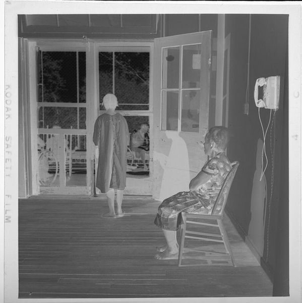 Editor: This is an untitled photograph by Jack Gould from the Harvard Art Museums, featuring a monkey in what appears to be a child’s outfit, inside a house. The scene feels surreal and a bit unsettling. How do you interpret this work? Curator: It's a striking image, isn't it? For me, it sparks a reflection on the blurred lines between humanity and nature. The monkey, dressed and inside a domestic space, disrupts our expectations. It makes me wonder about themes of control, domestication, and perhaps a commentary on societal roles. What do you think the artist might be suggesting with such a juxtaposition? Editor: That’s an interesting perspective. I hadn’t considered the element of control. The photo leaves me with more questions than answers. Curator: And that, my dear, is often the mark of truly compelling art. It invites us to look inward and question our own assumptions.