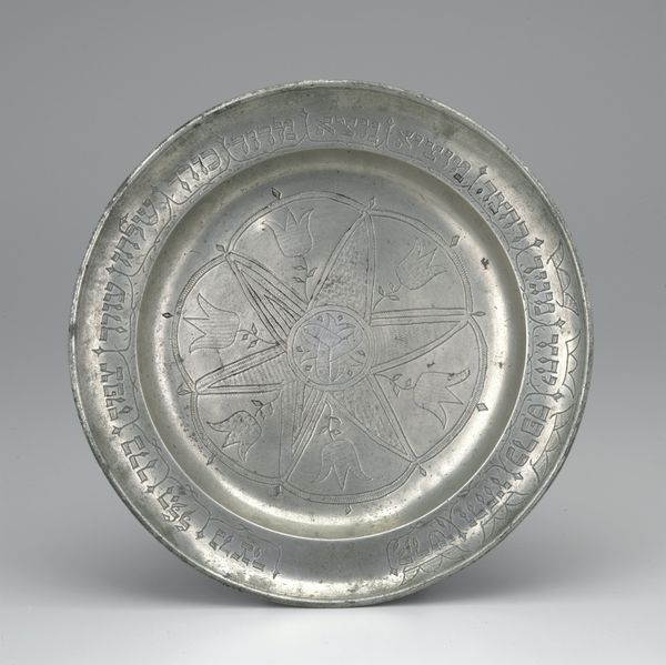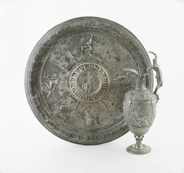 Curator: This is a plate by Paulus Öham, crafted around 1660. Notice the use of relief in its metal and ceramic construction, a stunning example of decorative art now housed at The Art Institute of Chicago. Editor: The plate has a weighty, almost somber presence, doesn't it? The cool metal and the detailed reliefs create a sense of depth, pulling you in. Curator: Absolutely. And the historical context here is key. Plates like this weren't mere tableware; they served as vehicles for storytelling, reflecting the socio-political climate and prevalent narratives of the time. This one depicts scenes reminiscent of classical history painting. It asks questions about whose stories are valorized. Editor: From a purely formal perspective, the composition is captivating. The central image is framed by these smaller vignettes along the rim; all organized to lead the eye in a circular dance around the plate. What about the techniques employed, the actual methods? Curator: Well, let’s consider that a piece like this may function ideologically by glorifying a select history. Understanding the processes—who made it, under what conditions, for whom— illuminates its function as both object and messenger. Editor: The sculptural images that wrap around the plate almost resemble stations on a wheel; or an evolving cyclical history. Curator: Precisely. This type of work challenges us to consider how notions of power, status, and historical memory were materially embedded in everyday objects, reflecting broader societal structures and biases. This plate then opens dialogues on craft, labor, and the very narratives we choose to preserve. Editor: Looking at it, I'm struck by the contrasting scales of detail. Each figure seems intentionally rendered, almost yearning to communicate beyond their circular boundaries. Curator: It's a piece that invites us to rethink the relationships between art, history, and identity, particularly within the context of decorative arts. Editor: It really prompts us to see beyond mere surface aesthetics, engaging with deeper formal and conceptual layers. Thank you.