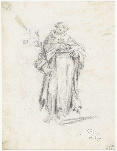 Editor: Here we see Jacques Callot's "Saint Peter," a drawing at the Harvard Art Museums. The figure seems both imposing and weary. What do you see in this piece, especially regarding its symbolism? Curator: Callot’s Peter is rendered with potent symbolism. Note the keys he holds, emblems of his authority to bind and loose. Do you see how they signify both access and restriction, a visual representation of divine power entrusted to a human figure? Editor: Yes, I see that now. The keys feel weighty, like a burden. Curator: Indeed, the weight of responsibility is palpable. Consider also the halo, a convention to indicate sanctity, yet subtly rendered, almost questioning. What cultural memory does this stir? Editor: I think it makes me consider the human aspect of sainthood. Curator: Precisely! It’s a powerful meditation on faith, doubt, and the enduring human struggle to embody spiritual ideals. Thanks for your insights. Editor: Thank you, I learned a lot.