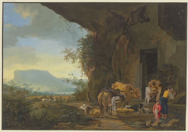Curator: This watercolor and tempera painting before us is entitled "Felsige Gegend mit einem Hirten, zwei Kühen, zwei Schafen und einer Ziege," or "Rocky Landscape with a Shepherd, Two Cows, Two Sheep and a Goat" by Christian Wilhelm Ernst Dietrich. It was completed around 1767. Editor: It’s…pastoral. Almost overwhelmingly so. There’s a sense of rest and a clear hierarchy. The strong diagonals lead the eye smoothly through the composition, and the careful placement of the figures – man and beast – generates an almost idyllic repose. Curator: Dietrich's process reveals a fascinating dialogue between artistic skill and the social realities of art production at the time. His skilled manipulation of watercolor and tempera was aimed at creating appealing scenes for bourgeois consumption. Editor: True, but the handling of light, see the way it delicately touches the leaves on the scraggly tree, really activates the scene, lending it a kind of spiritual tranquility. There's a structured play between light and shadow here. Curator: I am also curious about the commercial aspect of landscapes at that time and how prints affected it. Artists began developing ways to easily make their work reproducible. So Dietrich may well have designed this piece to circulate on a mass scale. Editor: That's quite possible, however, the composition and tonal range suggest a highly refined sensibility. Think about how the coolness of the distant mountains plays against the warmer hues of the foreground rocks, creating spatial depth and harmony. The semiotics here are remarkable. Curator: Yet, wouldn't it be compelling to explore the economic exchanges between the artist and the patrons? Who owned the livestock featured here, what were their grazing rights, and how are those power dynamics reflected in art's very making? Editor: Undoubtedly crucial, but let's also acknowledge the formal devices at play. Dietrich's brushwork, though delicate, contributes to a robust overall design. One needs that balance between what art depicts and how it makes you see. Curator: In observing all of this, I'm left reflecting on the relationship between the material conditions and our aesthetic appreciations. Editor: And for me, reflecting on the intricate arrangements can indeed unlock hidden qualities within this serene scene.