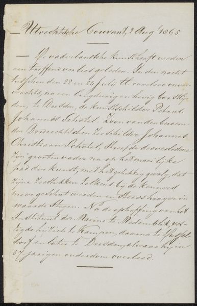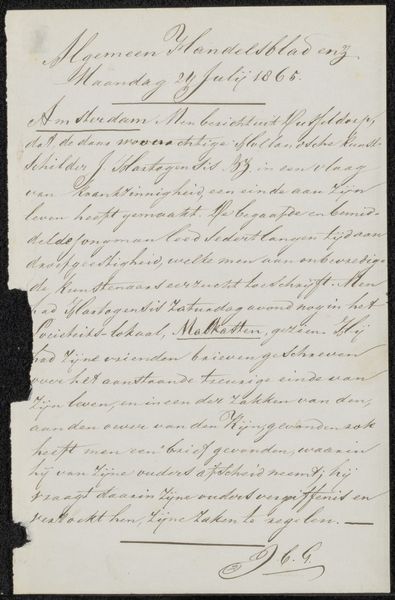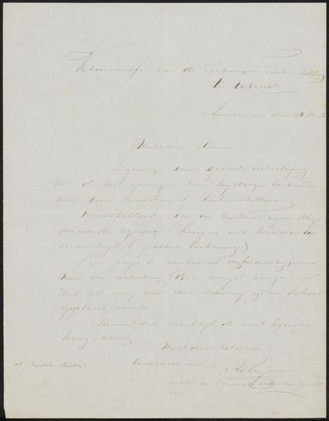 Curator: It gives the immediate impression of fragility, doesn’t it? Almost spectral, fading from view. Editor: Indeed. What we have here is a letter—the title is "Brief aan de Comissie van Beheer van de Kunststichting Arti et Amicitiae." It was very likely penned in 1844 by James de Rijk, using ink on paper. Curator: The visual texture of the handwritten script is so dominant. The letter's edges appear torn, imparting a rawness that contrasts with the formal grace of the lettering itself. See how the varying pressure of the hand creates subtle nuances of dark and light in each stroke. It’s beautiful. Editor: It is! Consider, however, the historical context of "Arti et Amicitiae"—an Amsterdam-based society championing the arts in the 19th century. Letters such as these were critical documents in the societal and institutional structures shaping the Dutch art world. Note the evidence of administrative markings in the lower left, too, signaling its reception and treatment by the Kunststichting. Curator: Yes, and the handwriting becomes almost abstract! Each character a small study in calligraphic line and form. The faded ink suggests both time and importance, a message considered precious and preserved. Editor: Yet it raises so many questions. What were the circumstances that lead to this letter being written? And what actions were taken by the commission that it was addressed to? One is struck, certainly, by the labor and material costs involved in producing such documents. The paper itself and the author’s careful penmanship speak of an older mode of governance and discourse, far removed from our own era of electronic messaging. Curator: I hadn't considered it that way. I am simply drawn to the rhythm and cadence, that strange beauty arising from these careful ascenders and descenders and, naturally, the contrasting darkness of the ink against the page. It embodies this tension so wonderfully, doesn't it? Editor: Absolutely. Studying pieces such as these serves to remind us about art's critical function within social and institutional structures. Each word written and recorded represents a contribution to wider debates and considerations which defined the art landscape and how decisions about art came into being at any given time.