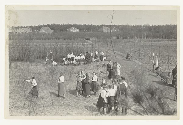 This photograph, "Verzorgen van de akker met zaailingen", meaning "Caring for the field with seedlings", depicts workers planting in a field. The image, made by an anonymous artist, captures a scene of labor, presumably in a rural setting. In the composition, we see figures, most likely women, bent over, working the land. The image evokes questions about gendered labor roles and the lives of agricultural workers. With its historical and social dimensions, the photograph is a study of identity and labor, particularly the frequently overlooked work done by women in agriculture. The photograph documents labor, and invites us to reflect on how it shapes identity and community, and how we value these contributions within a broader social and economic framework. The photograph becomes a testament to the lives and labor of these women, providing a glimpse into their daily existence.