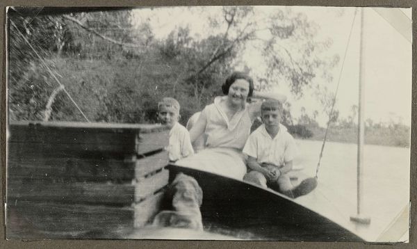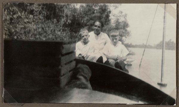 This anonymous photograph captures a group on a riverboat. The eye is drawn to the composition's interplay of light and shadow, the contrast creating a sense of depth within the monochromatic palette. The arrangement of the figures and objects within the frame appears almost staged. Note the placement of the child at the edge, his gaze directed outward, establishing a connection between the image and the external world. The texture of the wooden crates in the foreground acts as a grounding element, balancing the open space of the river and trees behind. The photograph destabilizes conventional portraiture through its informal, almost candid aesthetic. It suggests a moment captured rather than constructed. It invites us to consider the semiotics of leisure and representation in vernacular photography. In this way, the photograph challenges us to decode the cultural codes embedded within its structure.
