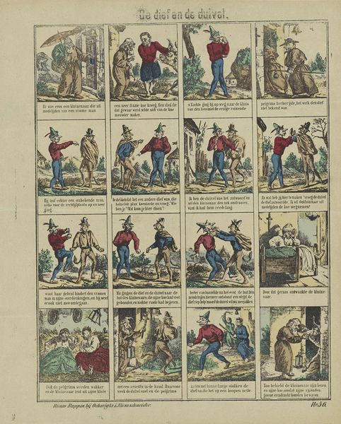 Editor: So, here we have "Marie het ongehoorzame meisje," or "Marie the disobedient girl", dating roughly from 1894 to 1959. It's a print from the Rijksmuseum collection. It reminds me a bit of a Victorian moral story told through a comic strip. What's your take on its historical significance? Curator: It’s interesting you see that "Victorian moral story" aspect. Looking at this through a historical lens, it is fair to say this artwork operates within the tradition of didactic popular imagery. How do you think prints like this one might have functioned in shaping social norms, particularly around childhood and gender, at the time they circulated? Editor: Well, each little scene seems to show Marie doing something 'naughty' and then facing some consequence. Perhaps it’s aimed at families, teaching children how to behave, and mothers how to discipline. Did art often function this explicitly as social instruction? Curator: Absolutely. In the 19th and early 20th centuries, we see the rise of mass media and visual culture being employed very deliberately in the project of nation-building and shaping individual subjectivities. Consider who the intended audience was, where they purchased their readings, or what the broader network of moralizing pamphlets was for its time. What societal expectations do you notice being upheld or challenged through the illustration and its corresponding Dutch captioning? Editor: That is interesting. Thinking about it now, what strikes me most is less the challenge, and more how deeply ingrained these types of social structures were in everyday life and how that transferred into the media of the time. It makes you think about how things have changed, and how they've stayed the same. Curator: Precisely! That's where the lasting impact lies. It serves as a potent reminder of how visual media actively contributed to shaping behavior. I agree – we also see many of the same cultural concepts alive today in new forms. Thanks for helping me explore that further!