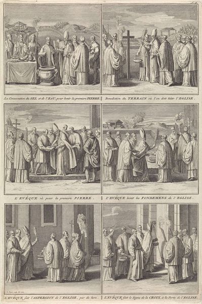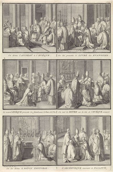 Editor: This is "Wijding van een abt, abdis en kloosterzusters" from 1722, made by Bernard Picart. It's a print – an etching and engraving. There are multiple scenes depicting religious rituals. The composition seems very structured, almost like a comic strip telling a story. How do you interpret this work? Curator: Let’s consider this print in terms of its materiality and production. The act of engraving and etching, the labour involved in creating these repeatable images, speaks to the democratization of religious imagery in the 18th century. These weren’t unique paintings for the elite; they were commodities circulating within a specific social context, yes? Editor: Definitely. The multiple scenes shown also give you a more complete look at religious rituals of the time. Does the print medium itself impact how these events are understood? Curator: Absolutely! The use of printmaking allowed for wider dissemination and consumption of religious iconography. Consider how the standardized format— the uniform lines, the precise details—served to solidify a particular visual narrative of religious authority and practice. Think about how this impacts and maybe reinforces social hierarchies. Are these depictions accurate, or are they idealized for a consuming public? Editor: I see. So, it's not just about the religious events, but about how the printing process itself shapes their meaning and distribution. Thanks, I'll never look at an etching the same way again! Curator: Indeed. By examining the materiality and means of production, we gain insight into the complex social and cultural forces at play in the creation and reception of art.