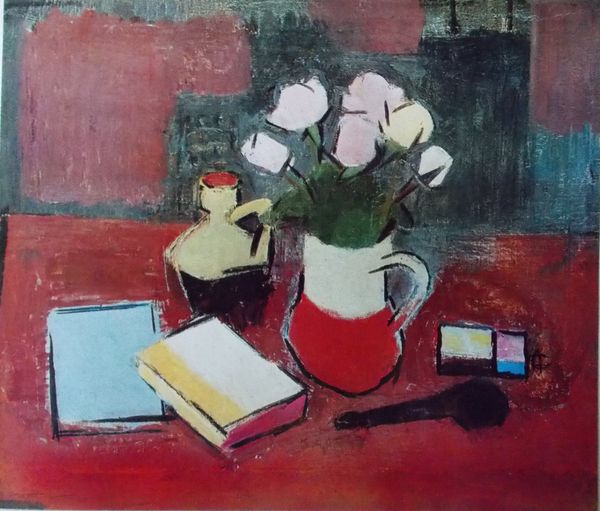 Curator: Henri Matisse painted "Still Life, Bouquet of Dahlias and White Book" in 1923. It's a vibrant oil on canvas. What's your first take on this scene? Editor: It feels so domestic, but in a staged way. Almost claustrophobic. The flattened perspective and repeating floral patterns of the wallpaper make it seem like the objects on the table are part of a tableau, rather than an observed reality. Curator: Precisely. Matisse's Intimist leaning allowed him to really play with domestic space as a site for experimentation with colour and form, drawing the viewer in to question our assumptions about ordinary objects. It’s interesting to look at the book, a “white book,” sitting in what should be an open space, available to receive new ideas. Editor: The positioning of the open book in the immediate foreground reads like an invitation, doesn’t it? It makes you wonder what stories it could tell or what insights it might offer if only we could lean in and read the words on its pages. There is a challenge of sorts to see, understand, know... Curator: A challenge for sure, but also an act of defiance, considering the socio-political milieu, post World War I. Editor: Yes, thinking about it in the broader context of post-war anxiety, that flat perspective could also be interpreted as representing the loss of depth and dimension following such a destructive event in European history, it definitely invites conversations around social fragility and recuperation of the self through aesthetics. Curator: I think it can be helpful to view Matisse’s fauvist years not merely as aesthetically-driven explorations but also, through his colour choices and arrangements, as expressions of an attitude to a society reconstructing after great and unprecedented political upheaval. Editor: Agreed. It's not just a pretty picture, then, but a complex statement on existence. Curator: Exactly, far from being superficial, its playful distortions challenge perceptions and propose alternative visual arrangements. Editor: I'll definitely think of Matisse differently from now on. It’s not just about capturing beauty; it’s also about a resistance, through art and life, in a society marred by the War.