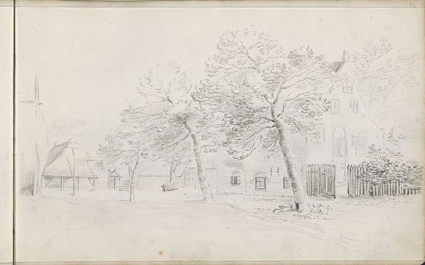 Editor: This is "Boerenerf met hooimijt en gebroken wiel" by Pieter Moninckx, created around 1645-1646. It's a delicate pencil drawing of a farmyard. There's a sense of quiet melancholy, maybe because of the broken wheel. What stands out to you about the composition? Curator: The beauty of this drawing lies in its structural clarity. Observe how Moninckx uses line weight to create depth. The foreground, delineated with darker, more assertive lines, grounds the composition, leading the eye towards the lighter, more ethereal rendering of the background structures. Editor: So the varying pressure of the pencil creates space? Curator: Precisely. It's a masterful manipulation of a simple medium to achieve spatial recession. Note also how the horizontality of the farm buildings and the hayrick is subtly disrupted by the vertical accents of the supporting posts and the tree. Editor: That adds a sort of...rhythm to the piece, doesn't it? And even that broken wheel you can appreciate from an aesthetic perspective. Curator: It interrupts the predictable pattern, adding visual interest. Semiotically, you might even read the broken wheel as a subtle commentary on the transience of rural life. But formally, it serves as a crucial element in the overall balance. Without it, the left side of the drawing might feel too empty. Editor: That’s fascinating. I initially focused on the representational aspects, but seeing how all of the elements work together abstractly provides a new way to look at it. Thanks for opening my eyes. Curator: Indeed, close visual analysis can reveal the underlying structure that supports meaning and aesthetic impact. It's a fruitful exercise, always.