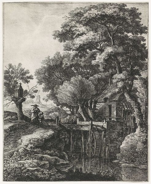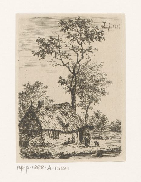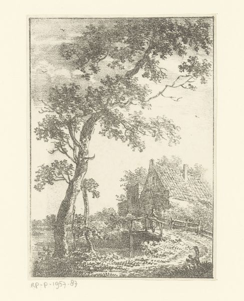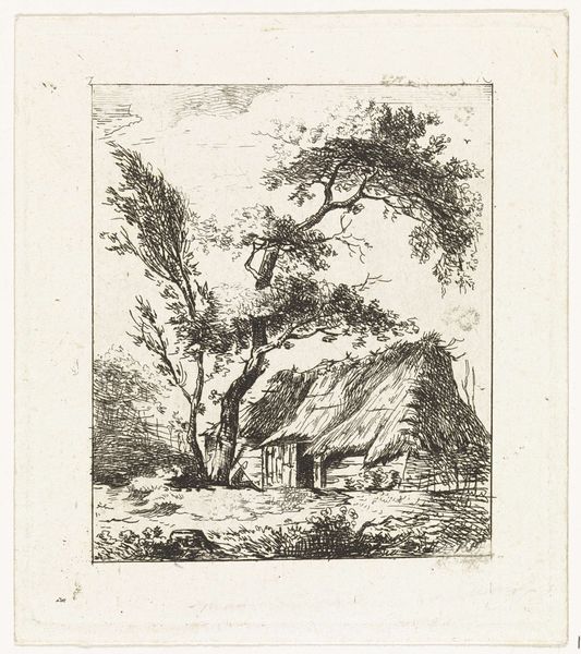 Curator: Oh, I am just completely drawn in! It’s got this quiet, almost secretive feel, like a memory half-forgotten, yet vivid. What’s this gem? Editor: This etching, titled "Boerderij met twee figuren"—which translates to "Farmhouse with two figures"—was created by Hermanus van Brussel before 1815. Notice how he uses the etching technique to render this scene. Curator: Van Brussel… right. Before 1815! That's pretty impressive control with etching to conjure up such a bucolic scene. The way the farmhouse sort of hunches under that big tree… it’s like they're sharing a secret. Editor: The composition certainly contributes to the sense of intimacy. Observe the contrasting textures. The meticulously etched roof tiles against the softer, blurred lines that delineate the foliage. Curator: Oh, absolutely. Those lines give it a kind of raw vulnerability. Almost as though nature itself is encroaching, reclaiming the space. Do you think that shed-looking thing by the water has just fallen, or maybe has always been in that awkward diagonal line? Editor: Formally, the placement of that angled shed guides our eye, creating a dynamic tension with the horizontality of the landscape. Functionally, though, one wonders if it provides more than just compositional dynamism, if it indeed has to do with storage of material used at that waterside. Curator: Good point. Materiality, I suppose. And there's this sense of scale… The figures near the river feel so small, almost overwhelmed. Is it romanticizing the life of a farmer? A quiet rebellion agains the modern times slowly crawling closer? Editor: One can argue it exemplifies the Romantic ideal. Observe the human form in scale to emphasize the grandness of the environment in Baroque and Realist traditions, too. The scale accentuates the emotional gravitas inherent in Van Brussel’s artwork. Curator: "Emotional gravitas"—I love that. Editor: I would simply stress how meticulously all elements are situated so that even now, looking at "Boerderij met twee figuren", the lines still converge to direct our eyes towards essential thematic points, or what may very well be themes in our own life. Curator: That pretty much captures its magic—doesn’t it? How simple means and forms tell our lives as we walk past them! Editor: Precisely. It underscores how studying seemingly rudimentary forms of art yields endless analytical avenues.