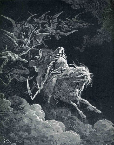 Curator: William Blake created this watercolor painting, “The Great Red Dragon and the Woman Clothed in the Sun,” around 1810. It’s based on a passage from the Book of Revelation. Editor: It's immediately unsettling. The way the dragon looms overhead, it feels heavy, oppressive. There is this contrasting light radiating from the woman. You see the dragon above and this almost earthy, writhing form—what could it be?—below her. What strikes me most is the tension between that earthiness and the light that shines off the woman and those globe-like forms above her head. Curator: Absolutely. Blake often used mythological and biblical scenes to critique contemporary society. Consider the historical context. This was the height of the Napoleonic Wars, a period of intense political and social upheaval. Blake saw the Dragon as symbolic of worldly power, corruption, and tyranny that oppressed spiritual values. Editor: Thinking about it as watercolor, the application is just extraordinary. There’s a texture to the Dragon's wings, it almost looks like old, beaten leather, and then next to that, these ethereal swirls, almost like he's captured movement with simple washes. It’s not just imagery; it’s the making process and materiality that enhances this dramatic conflict, that makes it potent and expressive. Curator: The politics are important here too. Blake aligned himself with those who felt spiritually oppressed. The woman represents the New Jerusalem, a symbol of hope and spiritual liberation. It is a historical yearning reflected across his entire body of work. Editor: Right, and look at the labor implied. The build-up of color, stroke after stroke, constructing not just an image, but an entire atmosphere thick with spiritual meaning. Even though this watercolor is not large in scale, its visual weight feels monumental. Curator: Blake's legacy, in this case, is how his art became a call for resistance against authoritarian control. It remains incredibly relevant. Editor: I find myself fascinated with his ability to use fairly humble materials—paper, water, pigment—to create something that feels simultaneously grounded and transcendental.