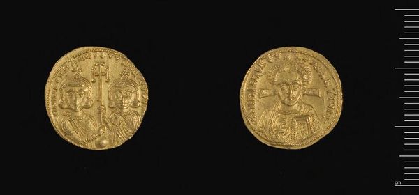 Editor: This is a gold coin featuring Justinian II. It’s incredibly small, yet it feels weighty with history. What statements were the Byzantines trying to make through these coins? Curator: The image on the coin would project the emperor's power and legitimacy. Do you notice how religious symbols are incorporated with the emperor's image? Editor: Yes, I see crosses. So, the coin is making a political statement by linking Justinian to both earthly and divine authority? Curator: Precisely. Currency wasn't just for trade; it was a form of propaganda, circulated widely and carrying potent messages about the Byzantine Empire. Editor: That's fascinating. I’ll never look at a coin the same way again! Curator: Indeed, it reveals the intersection of art, power, and belief in shaping public perception.