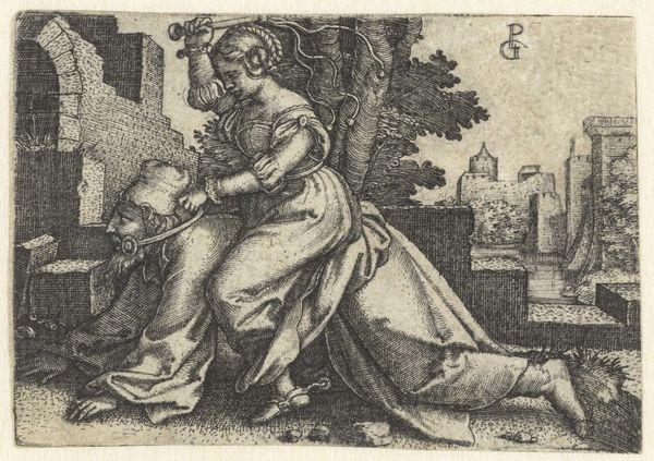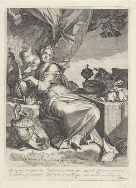 This engraving, titled ‘Verleidster’ and made by Gillis van Breen around the early 17th century, presents a scene filled with symbolic tension, rendered in fine lines and stark contrasts. The composition is dominated by a female figure riding a pig, set against a backdrop of architectural structures and ominous skies, which evoke a sense of unease. The figure's provocative stance and haughty look introduce a challenge to established moral categories. The choice of a pig as her steed is particularly striking. In semiotic terms, the pig traditionally represents lust and vulgarity. Juxtaposed with the woman's sensuality, the pig destabilizes conventional associations of beauty and virtue. The surrounding elements, such as copulating dogs, and the verse beneath the image, serve as cultural codes that enhance the understanding of the artwork’s subject matter. Ultimately, the formal elements of the engraving serve to challenge fixed meanings. By using allegory and symbolism, van Breen encourages viewers to engage in their own interpretation and re-interpretation.