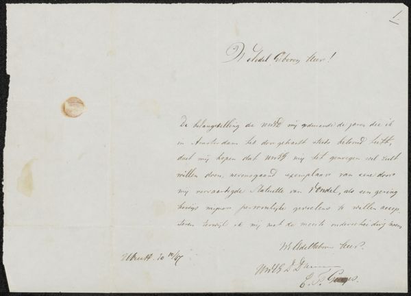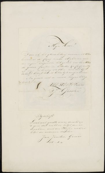 Curator: This rather curious item is entitled "New Year's Letter from the Artist with an Obscene Marginal Sketch," created in 1865 by Fritz Bamberger. It’s currently held in the Städel Museum collection. It’s rendered with pencil and ink on paper. Editor: Well, that’s certainly… something. The letter itself seems almost formal, with elegant script, and then bam! That sketch at the bottom is unexpected. What do we make of that? Curator: Indeed. Consider this: letters at this time served multiple functions, both personal and semi-public. Bamberger was corresponding within an established circle, so this "obscene sketch" might function as a form of playful critique or commentary within that group's shared context. The use of caricature also situates it within a longer tradition of satirical art. Editor: So, almost a kind of inside joke? And given the timeframe, shortly after the failed 1848 revolution in Germany, perhaps the sketch could also be read as a critique of authority or established social order. After all, visual humor has long served as a subversive tool. The letter might signal that in his close personal correspondence, he adopted a rebellious attitude, which remained discreet in his public work to secure the favor of powerful patrons. Curator: Exactly! Bamberger himself came from a family of Jewish merchants and, despite achieving some recognition, likely still experienced certain societal limitations. This kind of bawdy humor might also have served as a form of release, or even a means of mocking those same societal norms. Editor: The stark contrast between the formal letter and the vulgar drawing is really striking. It challenges conventional interpretations. Who gets to decide what’s appropriate or not? What are we willing to accept within established institutions? Curator: And how can a personal touch re-insert the messy truths about living within systems? This letter offers us an important counterpoint in considering Bamberger’s larger artistic output, urging us to view the work within the framework of political realities. Editor: I appreciate that a seemingly innocuous item can actually reveal the tensions that underpin societal norms. I like how art can uncover more layers of understanding.