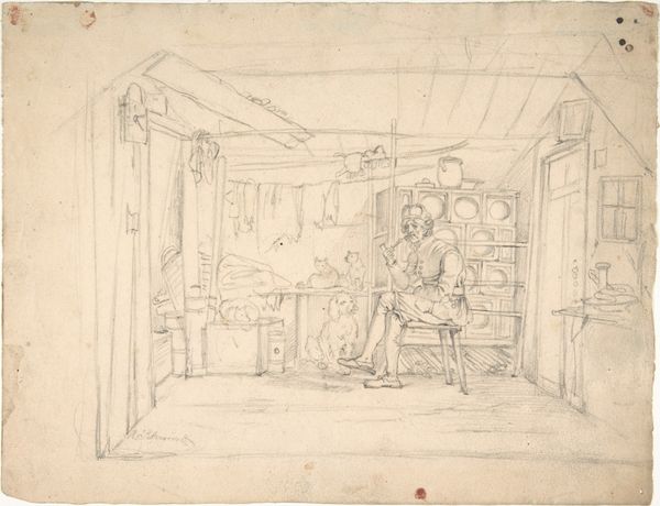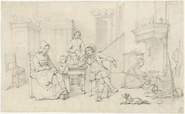 Editor: This pencil drawing, "Interieur met ouders met kind bij haard," by Pieter Bartholomeusz. Barbiers, made sometime between 1782 and 1837, captures a family scene indoors. It's really spare in its detail, almost like a stage set. What strikes you about it? Curator: Well, isn't it intriguing? For me, it whispers stories of daily life, of intimate family moments huddled around the hearth. The starkness, as you called it, gives it a ghostly feel, doesn't it? Like a memory half-recalled. The way the artist uses line, so delicate and suggestive… it feels almost… vulnerable. What do you think Barbiers wanted to show us here? Editor: I suppose the family’s comfort, maybe? The fire, even just sketched in, promises warmth. Curator: Precisely! Warmth, yes, but also stability. Home as refuge. Look at the angles of the lines—how they seem to converge, drawing your eye to the family grouping. It's almost stage-like, you're right; as if we're peering into their private world. Almost spying… does that make sense? And the almost aggressive simplicity is almost confrontational for its time. No flourishes to distract. The pure interior, for what? What might be going on *outside* that space, do you imagine? Editor: A world of revolution, perhaps? Given the time period? Curator: Ah, see! You’re thinking. Yes! Revolution raging, ideals crumbling... Home becomes a sanctuary, the one constant in an age of shifting sands. What was the old expression about a man's home…? I suppose times haven’t changed. But look closely at those barely-there walls – how strong can that protection be? Editor: That's given me a lot to consider – the comfort but also the fragility. Thanks! Curator: My pleasure. Perhaps art is about asking more questions than it answers, eh? Something I seem incapable of doing in small measures. Thanks for listening.