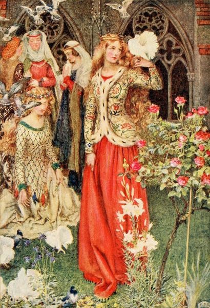 Curator: I find myself captivated by the light. There’s a beautiful softening, particularly in the faces of the women in the composition. Editor: That softening definitely lends itself to a romantic, even escapist quality, which is a signature element in the works of John William Waterhouse. This painting, entitled "The Enchanted Garden," completed in 1917, offers a window into his pre-Raphaelite inspired world, but let’s unpack those visual cues. What do you notice in the arrangement? Curator: The positioning of figures, their relationships implied by glance and gesture—the scene is obviously staged, almost theatrical. The eye is led diagonally from the cloaked figure at the left, through the cluster of women, and concludes with the male figure at the fountain. Waterhouse organizes them using subtle tonal shifts, from the dark reds on the periphery towards paler colors in the middle ground. Editor: I appreciate that reading. Waterhouse, during this period, like many artists, sought to grapple with representations of femininity. There's a complexity to this group of women—they appear as archetypes perhaps: maiden, mother, temptress? How might their attire, gestures, the garden itself, convey notions of women within societal structures of the time? Curator: The garden setting is pivotal here. Gardens in art are frequently depicted as sites of either sanctuary or danger, most often coded with notions of forbidden knowledge or lost innocence. The women are positioned as both inhabitants and products of this carefully curated, cultivated space. They are both bound and defined by the constraints of the space, perhaps embodying ideals and expectations placed upon them by the male gaze that certainly dominated painting traditions throughout art history. Editor: The composition offers a subtle tension; their idealized beauty contrasts with the looming war and societal shifts. Waterhouse’s use of classical elements, combined with an emerging Symbolist sensibility, reveals an artist aware of tradition yet striving to articulate modernity. Curator: It leaves me pondering the role of escapism during times of conflict—Waterhouse seems to construct this imagined world to either distract or perhaps provide solace during a difficult moment in world history. I wonder if this piece challenges, reinforces, or maybe attempts to re-write societal constructs of its time. Editor: Ultimately, this particular piece sparks more questions than answers for me, revealing that within what might seem like a straightforward pastoral scene lies complex dialogues of culture and construction.