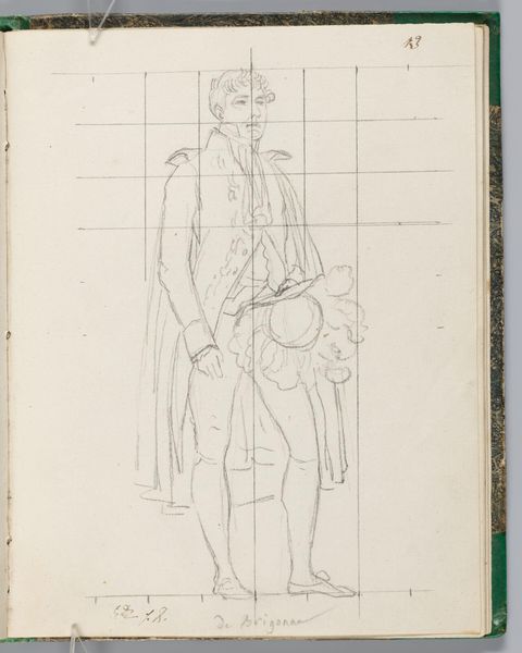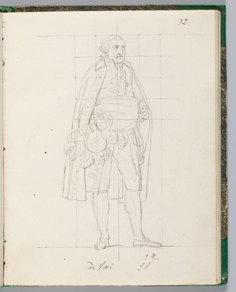 Curator: This is Jacques-Louis David’s sketch of Taillepied, Comte de Bondy, part of a larger visual world tied to power and privilege. Notice the grid lines. Why do you think David, known for his revolutionary allegiances, would sketch a figure of nobility like this? Editor: It's just a quick sketch, so perhaps he was commissioned? It feels like an exercise in portraying status. What does it say about class and representation at this time? Curator: Exactly! David, despite his revolutionary fervor, navigated a world deeply rooted in patronage. This sketch reveals the complex negotiation between artistry and social standing, raising questions about the artist's own positionality and the sitter's role in perpetuating a system of power. Editor: That's a great point. It’s more than just a portrait; it's about the systems at play. Curator: Precisely. And understanding those systems allows us to critically engage with the artwork's meaning.