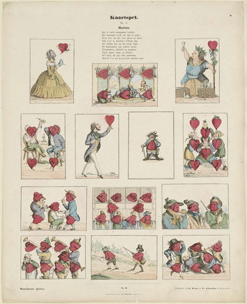 J. Beeg created this print titled ‘Kaartspel. / Nr. 2. / Ruiten’ which translates to ‘Card Game. / No. 2. / Diamonds’. Without a date, we can still try to situate this artwork in its cultural context. The print visualizes the ‘game’ of diamonds through different social classes. We see merchants, soldiers, and what appears to be working class people. Each group is shown interacting with diamond shapes, perhaps suggesting how wealth and social status permeate different aspects of society. The expressions and interactions of the figures evoke a sense of both comedy and social critique. The exaggerated features and postures of the characters satirize societal roles. Are these merely caricatures, or do they reflect deeper issues of class division, and social mobility? It’s interesting to consider how the artist uses the diamond symbol, traditionally associated with value and material wealth, to comment on the social dynamics of their time. It invites us to reflect on how societal structures and the pursuit of wealth shape human interactions.