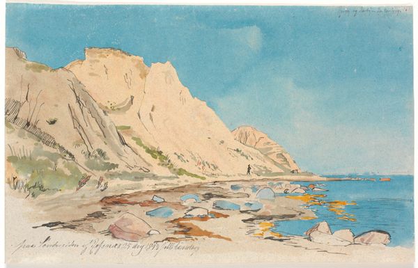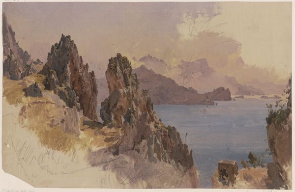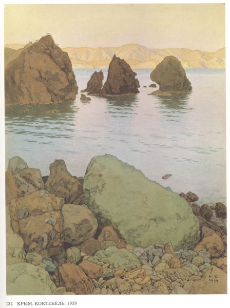 Editor: This is Ivan Bilibin's "Crimea. Batiliman," painted in 1940, supposedly en plein air and in watercolor. I am immediately struck by the heavy use of rock as subject matter and its presentation; the artist doesn't shy away from its crude monumentality! What are your first impressions? Curator: The prevalence of rocks in this "Crimea. Batiliman," presented during a tumultuous year like 1940, directs us to consider its material composition beyond just watercolor on paper. Consider Crimea’s complicated historical position as the Soviet empire consolidated. Do you not think the very labor of extracting and forming those rocks – by natural means, surely, yet present in the final view – whispers of labour and extraction in the political sense? Editor: I hadn’t thought of that at all! So, you’re suggesting the painting's value comes not just from its aesthetic quality, but from its inherent connection to labor and the manipulation of materials? I suppose the rocks aren’t merely representational here, but almost… evidence? Curator: Precisely. Each visible stroke, each carefully rendered stone, acts as a record of artistic and geological effort. How the watercolour interacts with the textured paper mimics natural erosion, doesn’t it? Consider what that implies: the tools available, the social pressures to reflect something honest of ‘Crimea’, the artist's intention… they become materially grounded by this confluence. Editor: It is making me reconsider the artist's perspective, and their role. Thank you! Curator: And likewise! It makes one look beyond the prettiness and wonder what all the rock actually means, in human terms.