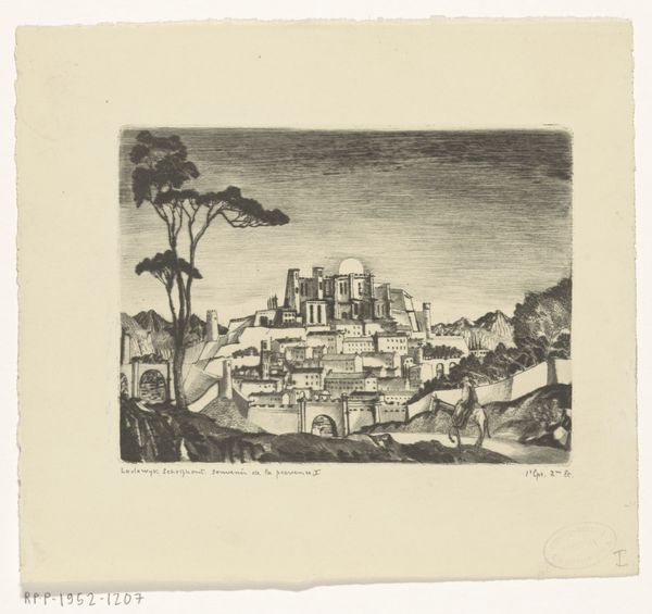 Editor: This is Lodewijk Schelfhout's 1942 etching, "Kasteel op een heuvel," or "Castle on a Hill." It's such a detailed little print. I'm struck by how the strong lines and contrast create a real sense of depth and monumentality. How do you approach understanding this type of landscape print? Curator: We must examine the intrinsic elements of this piece. Observe how Schelfhout masterfully employs linear perspective. The lines of the bridge, the road winding up the hill, and the receding planes of the buildings all converge, guiding the eye. Do you notice the density of line and tone at the top in the sky versus the more sparse rendering in the middle ground? Editor: Yes, the upper area seems much heavier, denser. So, that contrast really emphasizes the castle perched at the top. Curator: Precisely. And consider the textures he creates using only etched lines. The rough stone of the bridge, the smoother surfaces of the buildings – it's all implied through the direction, density, and weight of the lines themselves. Look also how that line directs the eye in upward visual motion. Editor: That’s interesting; I hadn’t thought about it as guiding movement rather than creating depth. The interplay of light and shadow makes the architecture almost pop off the surface. Curator: Notice also that figure on the horse crossing the bridge; see how it punctuates an otherwise empty pictorial plane at the base? How does that detail contribute to the overall composition? Editor: That makes me notice the scale and relative isolation even more. All of the visual tension in this work gives so much expression, and seems an especially powerful effect for such small work! Thanks. Curator: Indeed. Close observation reveals much about the artist's technique and compositional intentions, more than a casual glance might suggest.