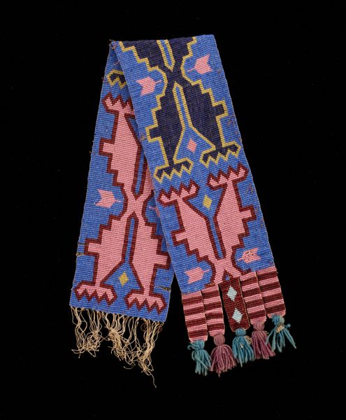 This apron panel, of unknown date and maker, presents a striking example of textile design. Its dimensions are modest, yet the panel commands attention through its intricate composition and vibrant color palette. The dominant form is a symmetrical, almost totem-like structure in shades of blue, pink and gold. This structure is bisected by a central axis, lending a sense of balance. The geometric patterns, however, resist any singular interpretation. Do the angular shapes suggest abstract figures, or do they represent something else entirely? The piece challenges conventional notions of meaning. The panel becomes a field where fixed interpretations dissolve into a play of signs. The artist invites us not to decode a static message, but to engage in an open-ended exploration of form and pattern. This panel compels us to look beyond the surface, engaging with a discourse on abstraction.