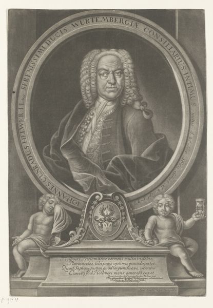 Editor: This engraving, titled "Portret van Michael Achatius Kirchner," dates from sometime between 1676 and 1729 and is by Andreas Geyer. The detail in the face and the wig is remarkable given the medium. The whole composition seems so meticulously planned and rendered. What formal qualities strike you most about this piece? Curator: The strength of this piece lies in its balanced composition and the clear contrast between the textures. Note how the smooth, almost porcelain-like quality of the face is juxtaposed against the elaborate, spiraling curls of the wig and the rich folds of the draped fabric below. The oval frame creates a defined space that focuses our attention, directing the eye inward. Editor: It almost feels like the frame is containing all of that... texture, that exuberance. Curator: Precisely. Consider also the strategic use of light and shadow. Geyer uses hatching and cross-hatching to model the forms, creating a sense of depth and volume. The artist’s command over the burin, a tool used for engraving, allows for precise control of line weight, thus manipulating light. Editor: So, the variation in line thickness creates the illusion of light and shadow? Curator: Precisely. The direction and density of lines produce tonal variations, suggesting the play of light on the surface. Also, consider how the engraver creates space and hierarchy. Editor: How so? Curator: Notice how the artist strategically places the inscription and heraldic shield to not only denote status, but create compositional stability in the lower register of the engraving. Editor: I never thought about it that way. It’s fascinating how the artist uses such simple lines to convey so much information and detail. I see now that all aspects of this engraving seem planned out, which contributes to a more effective expression. Curator: Indeed, examining the formal elements allows us to appreciate the artist's skillful manipulation of visual language.