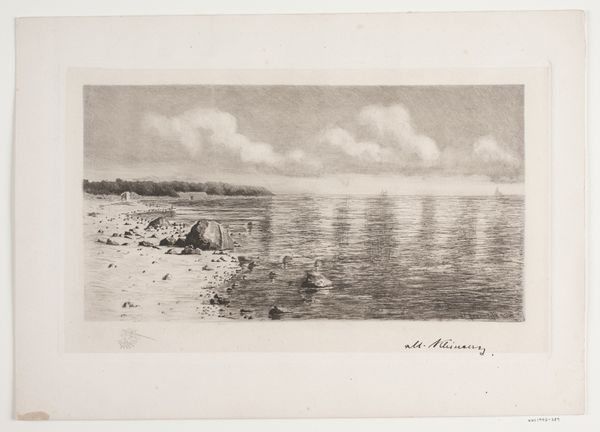 Carl Bloch made this print of a beach with a line of trees next to the water using etching. The image seems simple, but its creation was tied up with the cultural project of creating a national identity for Denmark. Notice the ships on the horizon, a reference to Denmark's history as a maritime power. The focus on the landscape coincides with an artistic movement throughout Europe to paint realistic scenes of the natural world. Bloch's Denmark was undergoing major social changes; after losing territory in war with Prussia, Denmark was trying to redefine itself through its cultural institutions, such as the Royal Academy, where Bloch taught. The image of the tranquil shoreline offered a vision of the nation as a place of natural beauty and peaceful contemplation, an attempt to present Denmark as a place of cultural and artistic importance. To understand the cultural significance of this etching, we can look to historical sources like exhibition reviews, biographies of the artist, and studies of Danish cultural history.