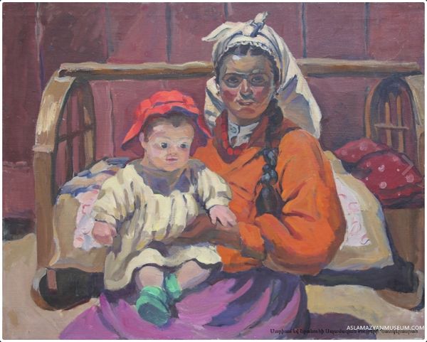 Editor: So, this is Samuel Mutzner's "With Mum," painted in 1925, using oil paints, seemingly with quite thick strokes, actually. It’s a fascinating portrait. I’m immediately struck by the expressiveness of their faces, though also with some sadness. What draws your eye when you look at this piece? Curator: That's a keen observation. For me, the vibrant colours contrasting with those melancholic expressions ignite my imagination. I wonder about the story, the personal connection captured with these thick impasto strokes – each one is like a whispered secret. Don't you think the naivete almost amplifies the feeling of raw emotional honesty? Editor: Definitely, it’s like the artist isn't trying to hide anything. But is the seeming lack of conventional technique on purpose, or is this what we might consider an untrained vision? Curator: Ah, there’s the rub, isn’t it? It straddles the line, beautifully. The artist probably uses fauvist colour boldness along with the expressionistic style to heighten those emotional resonances... It's an exciting balancing act: conscious artistic choice intertwined with, as you say, perhaps a "naive" lens. It makes you feel something, doesn't it? Editor: Absolutely. I love that contrast – trained or not, the rawness gets right under your skin. I didn’t expect it to speak to me like that. Curator: It’s wonderful, isn’t it, when a piece challenges our assumptions. "With Mum" – Mutzner gives us a vibrant story where technicalities fade and a heartfelt connection is crystal clear. An art encounter for the soul.