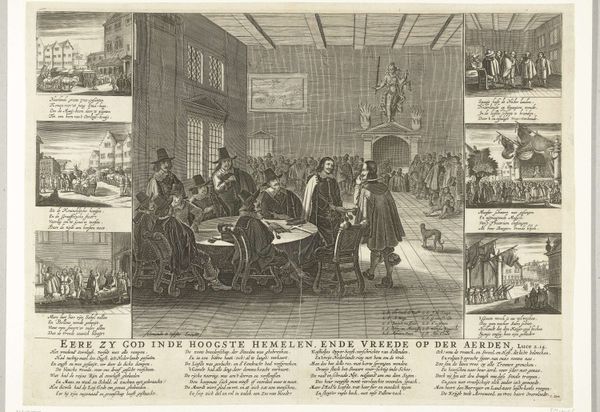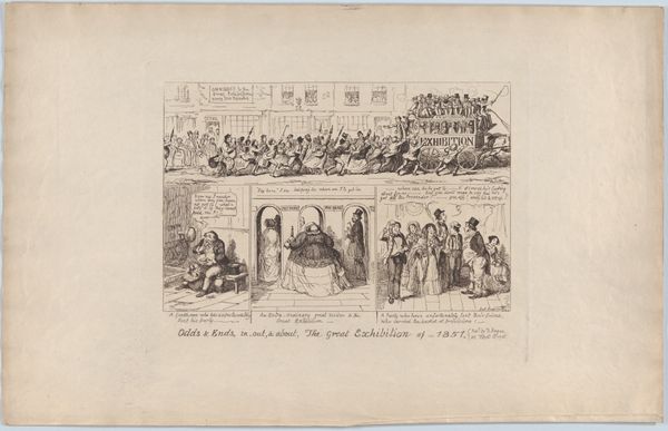Gerardus Johannes Bos created this print in 1863 for the Leiden student almanac. The lithograph, with its meticulous lines and grayscale tones, presents a multi-layered narrative within three arched frames, inviting an exploration of its structural composition. The artist employs a triptych-like format to dissect student life. Each arch, like a stage, presents a tableau of scholarly and social scenes across two levels. The composition is busy, filled with figures, objects, and inscriptions. Each scene seems to embody a different aspect of student existence from study and domestic life, to philosophical pursuits, and legal entanglements. The use of text as integral to the visual narrative encourages us to decipher the satire. The rigid structure of the print, however, creates a sense of order, perhaps reflecting the structured environment of academic life. Bos uses division and arrangement to dissect student culture. In doing so, the artist offers a critical reflection on student life and its engagement with societal norms. This complexity within the print invites ongoing interpretation.