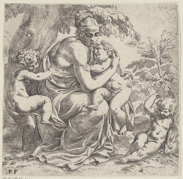 Louis de Deyster created this etching, “Twee amors,” around 1698. Two cherubic figures dominate the composition, set against a detailed backdrop of foliage and classical architectural fragments. Deyster uses line to create depth and texture. The fine, closely spaced lines in the foreground contrast with the more open, sketch-like rendering of the background, drawing our eye to the cherubs. One cupid stands, bow in hand, while the other reclines on a stone, perhaps contemplating the act of love or mischief. The contrast between activity and repose adds a dynamic tension to the scene. The architectural elements, such as the partial column, are not merely decorative. They ground the scene in a tradition of classical art, while the cherubs themselves—symbols of desire and affection—inject a playful ambiguity. The artwork destabilizes the gravity of classical themes with the levity of cherubic figures. Through the strategic use of line and form, Deyster creates an image that is both formally rigorous and playfully suggestive.